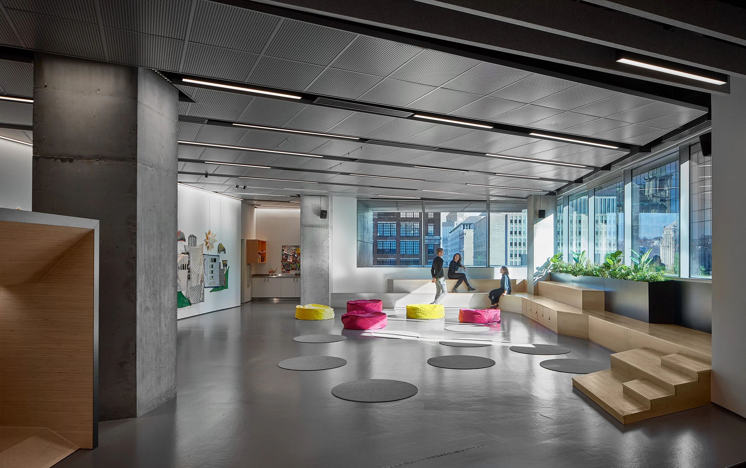 Mir Collective designed the transformation of the sixth floor of the Lois & Richard Rosenthal Center for Contemporary Art adding new galleries, artmaking studios, and gathering spaces. The first phase of the 9000-sf renovation opened the top level of the Cincinnati Contemporary Art Center (CAC) to city views, gallery connections, and spaces for small and large group interactions. The design promotes indoor environmental health and sustainability in both architectural and art-making material choices. Phase II will include new outdoor galleries enabling ecologically-focused, living art while offering an exemplary model of art-making experiences. The design celebrates Zaha Hadid’s iconic 2001 building by enhancing physical and programmatic connections between the 6th floor, the city, and its communities while leaving the exterior views of the building unchanged.
